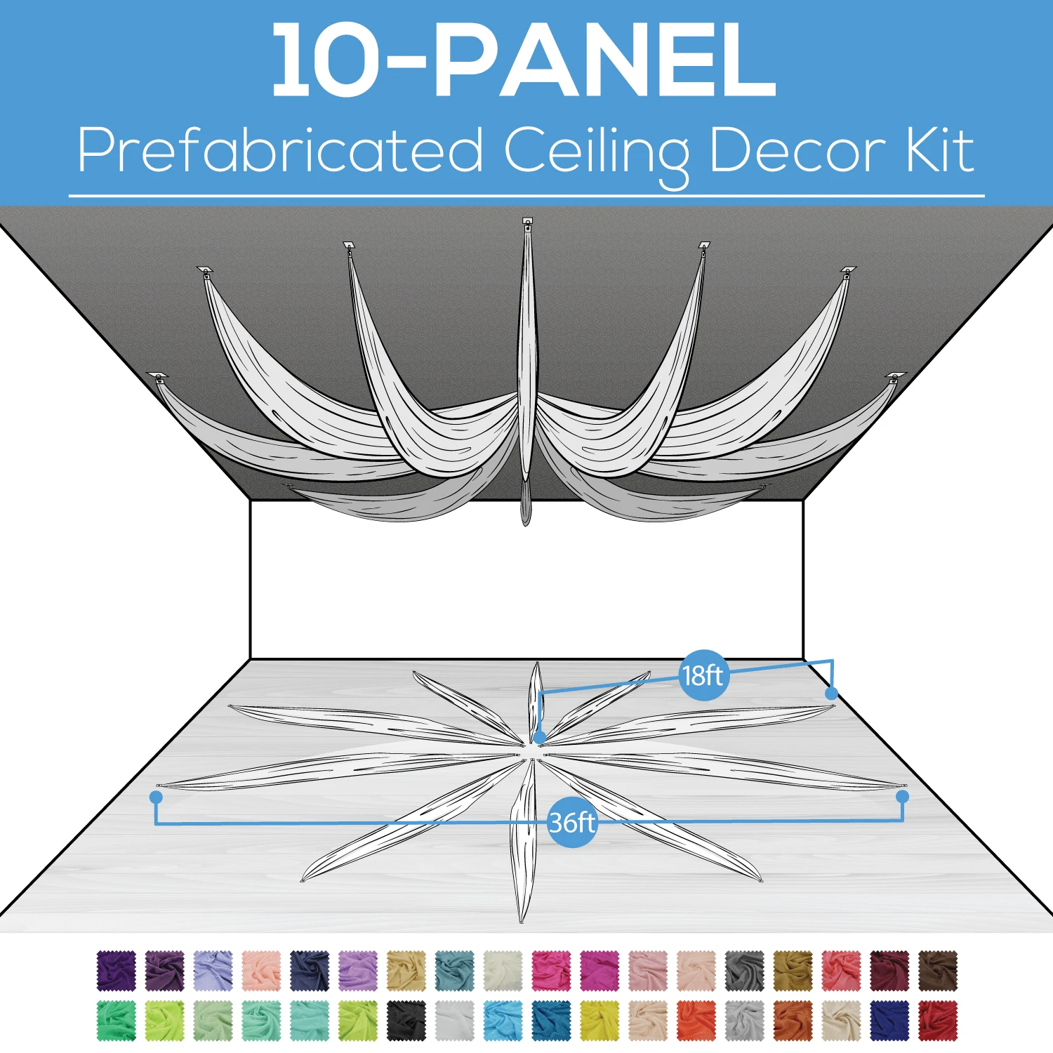 MEASUREMENTS: Each panel is 18ft long making the total diameter of this ceiling kit 36ft.