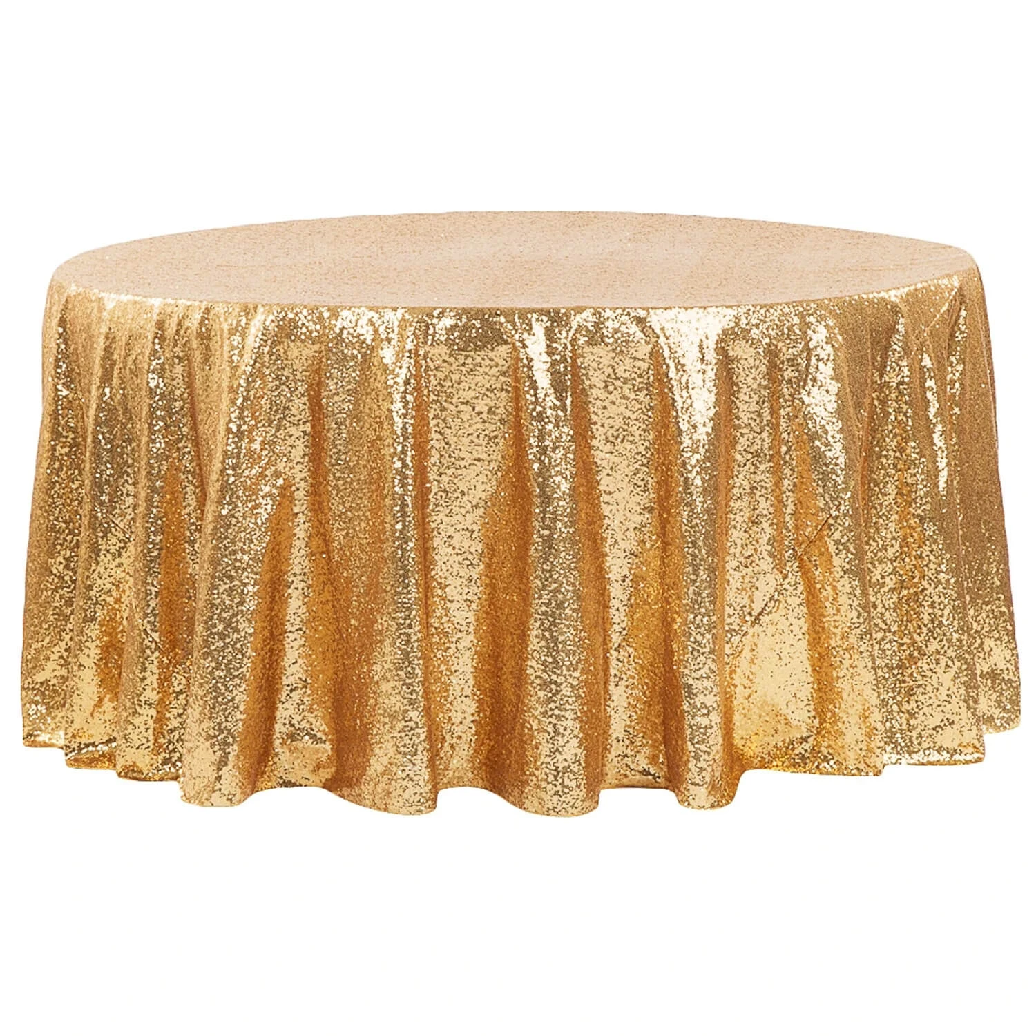 Knock the socks off of all those party-goers with these solid round Glitz Sequin Tablecloths! Whether throwing a dazzling wedding or a boisterous birthday, this Premium glimmering table linen is popular for good reason and now at your disposal should you desire to add a dash of its dazzling opulence. The gold tone gives it an especially celebratory feel.Â