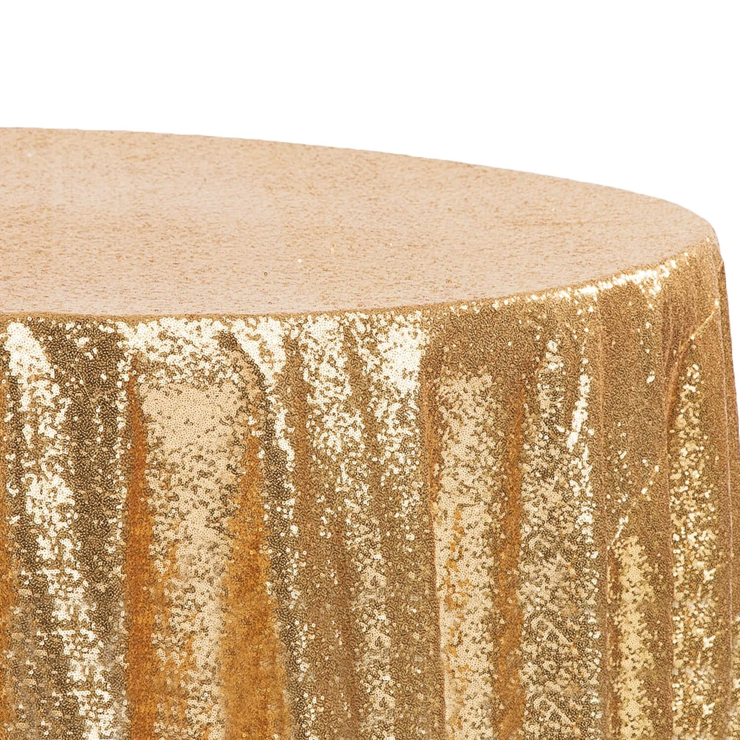 Knock the socks off of all those party-goers with these solid round Glitz Sequin Tablecloths! Whether throwing a dazzling wedding or a boisterous birthday, this Premium glimmering table linen is popular for good reason and now at your disposal should you desire to add a dash of its dazzling opulence. The gold gives it an especially glamorous and timeless tinge.Â