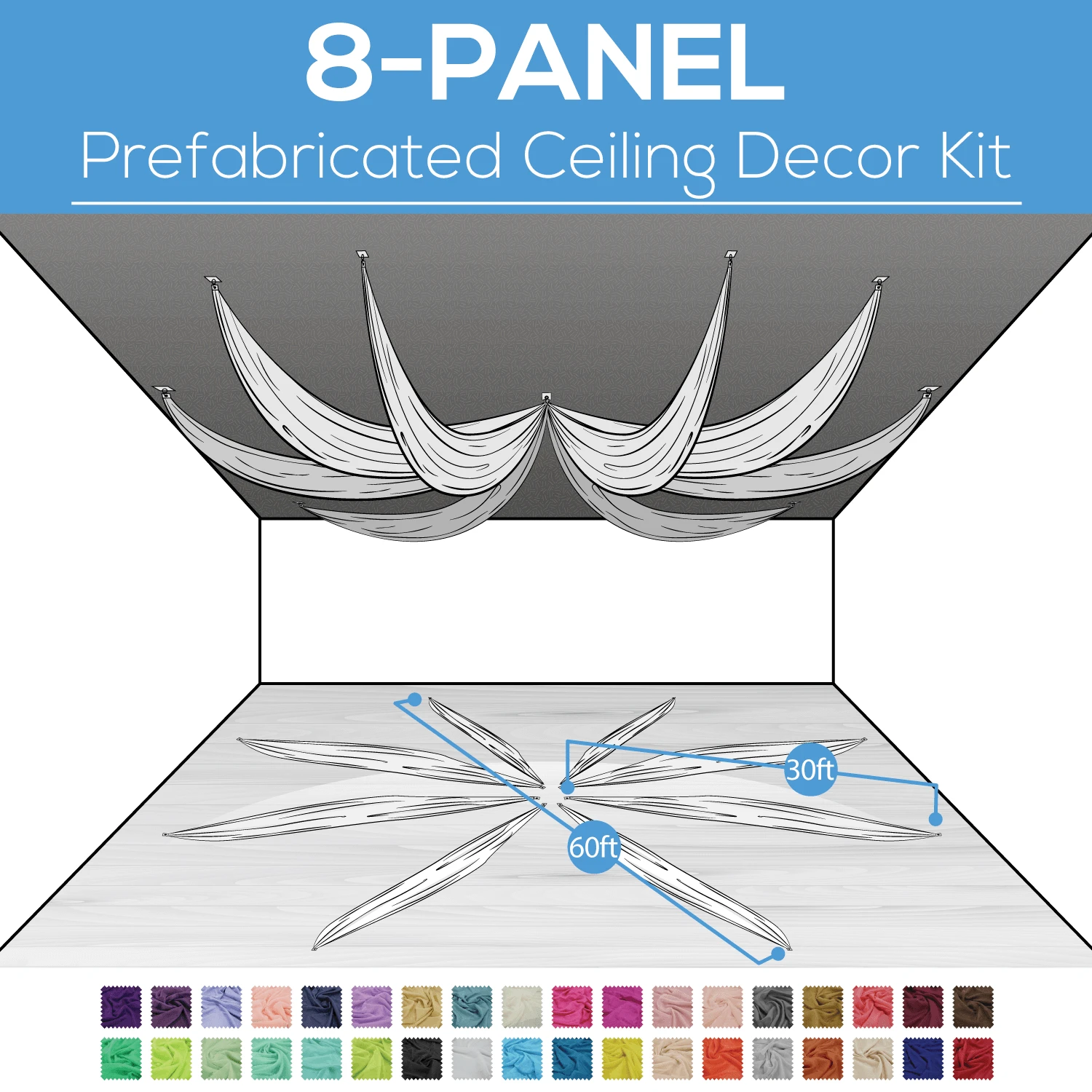 MEASUREMENTS: Each panel is 30ft long making the total diameter of this ceiling kit 60ft.