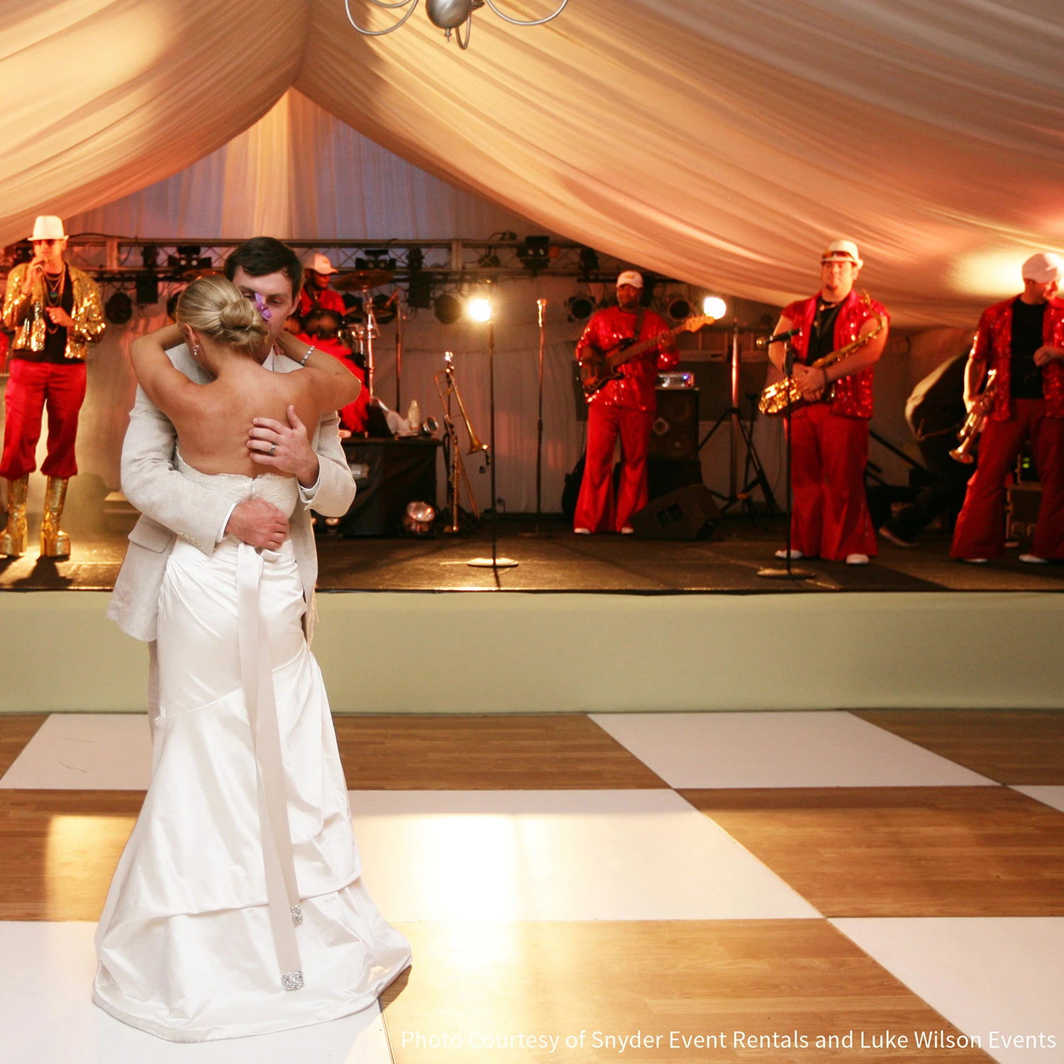 Our composite laminate, high quality, large panel, dance floors are water, scratch, and weather-resistant. An exterior grade, moisture resistant, 3/4″ plywood base, a pressure treated composite laminate top, and a resin coated backing, make these laminate dance floor one of the most durable floors available.