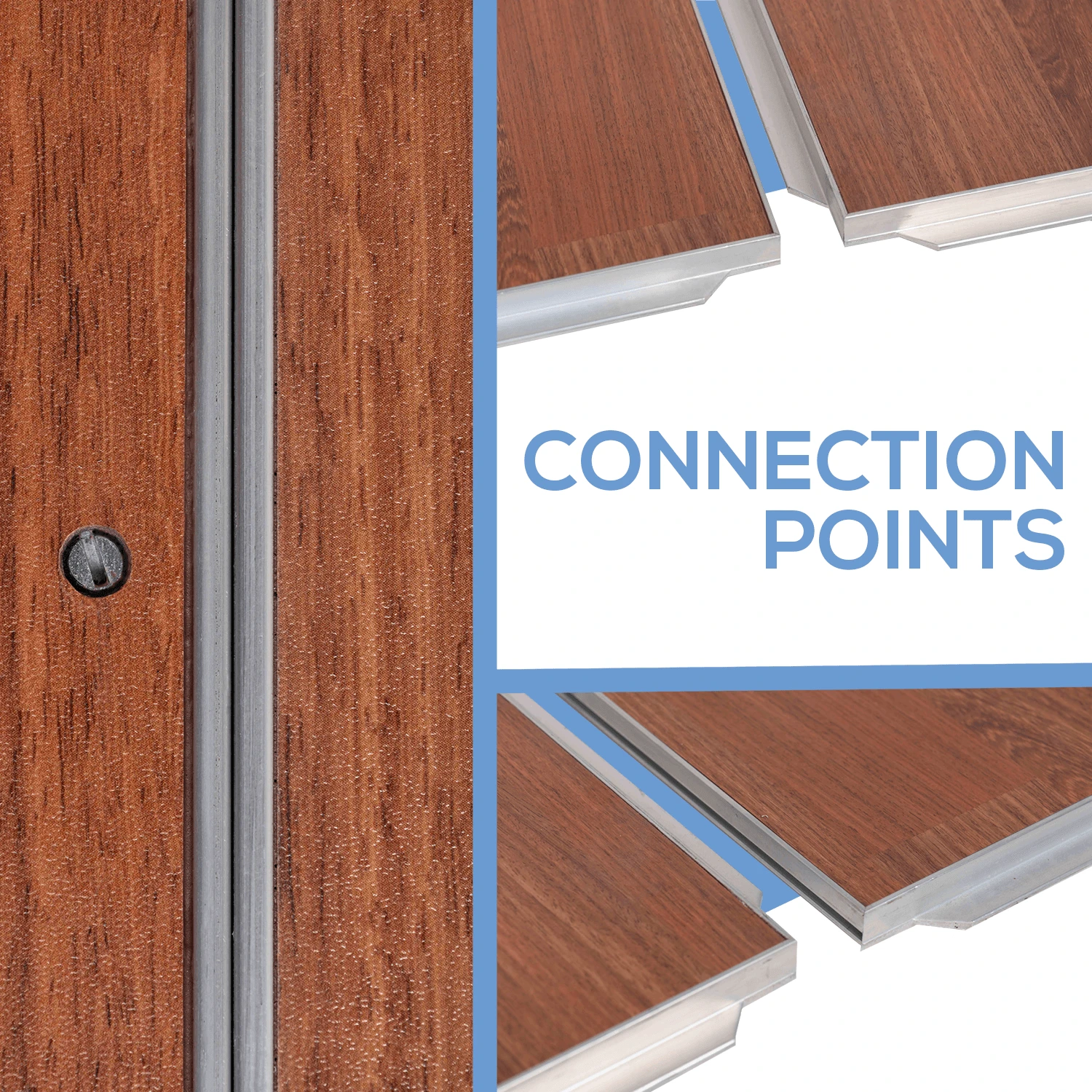 Easy Connection and Installation – Our composite laminate panels use a unique, tongue-and groove connection system which is simply aligned and then screwed in place to form a secure, seamless connection that prevents panels from pulling apart, up, down, or sideways. These panels are designed to create an even, stable dance surface over unprepared or uneven ground indoors and out.
