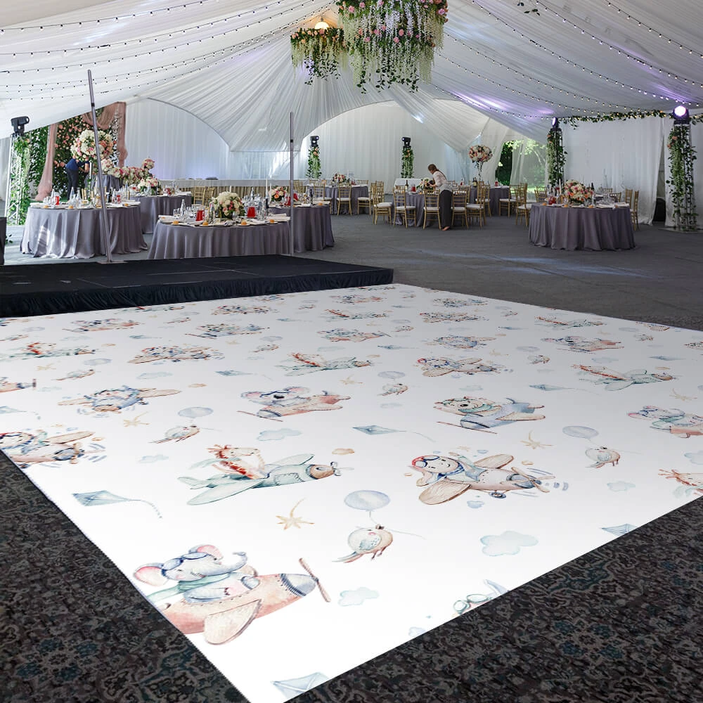 This custom size dance floor wrap will transform your venue! Our Flying High design belongs to our “Boys Birthday” print designs for your most upscale events.Â