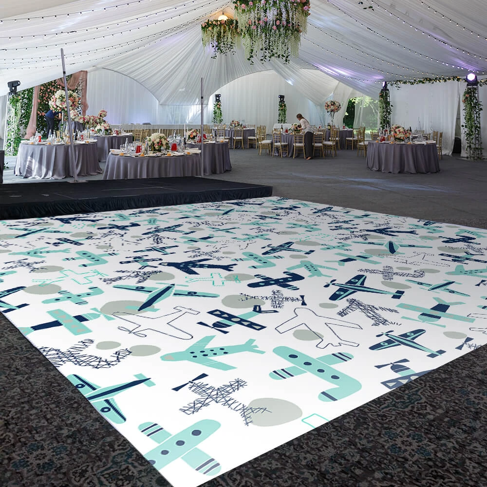 This custom size dance floor wrap will transform your venue! Our Jet Set design belongs to our “Boys Birthday” print designs for your most upscale events.Â
