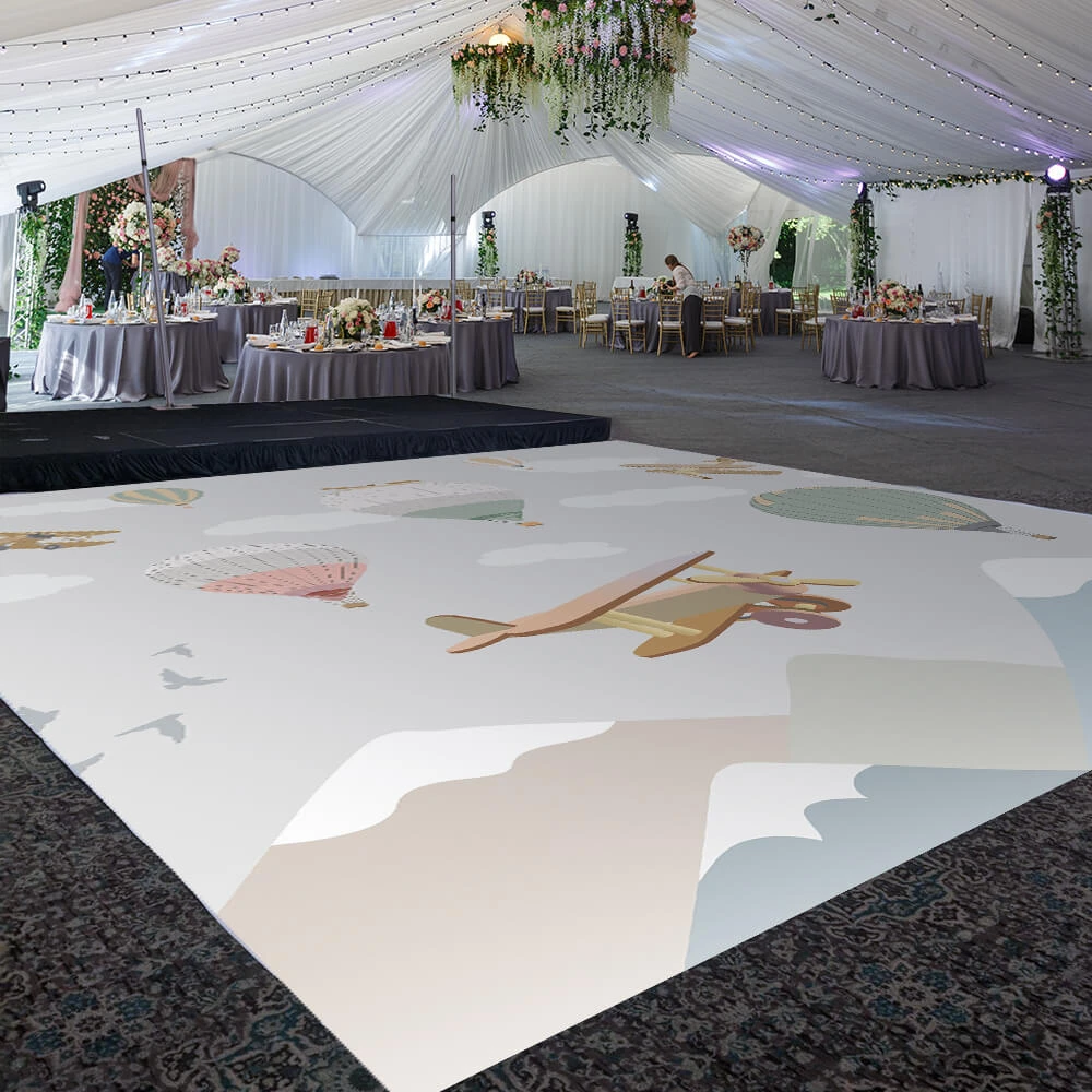 This custom size dance floor wrap will transform your venue! Our Fly in the Sky design belongs to our “Children’s Birthday” print designs for your most upscale events.Â