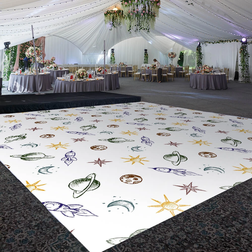 This custom size dance floor wrap will transform your venue! Our Out of this World design belongs to our “Children’s Birthday” print designs for your most upscale events.Â