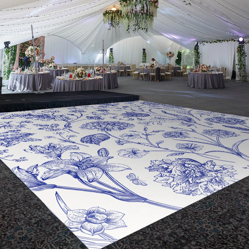 This custom size dance floor wrap will transform your venue! Our Blue Bliss design belongs to our “Classical” print designs for your most upscale events.Â