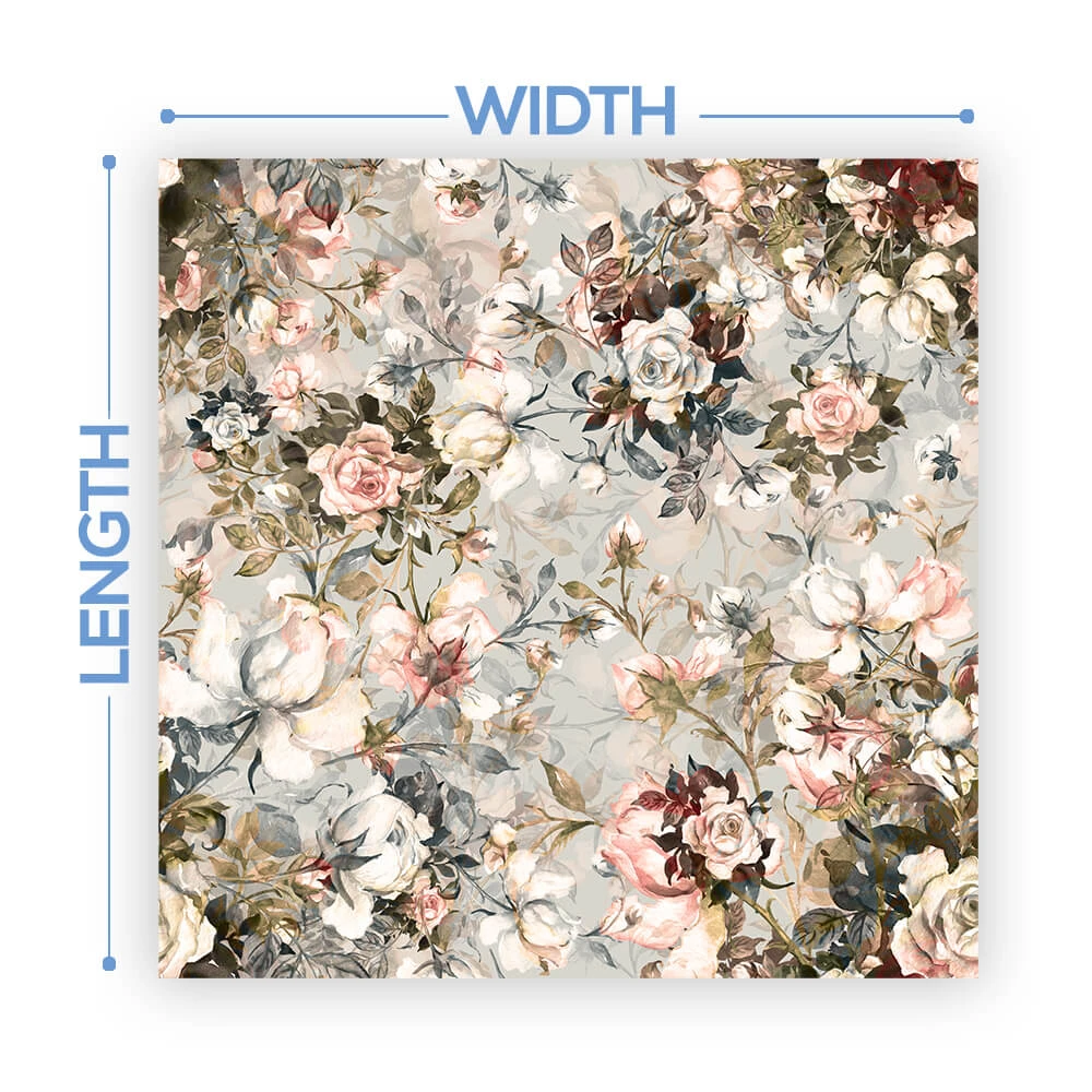 The width of the vinyl is 54″. We will cut the total length based on the size of your dance floor. Floors will come on a single roll requiring the installer to cut each row at design cutlines. These cut lines are printed on the design to make it easy!