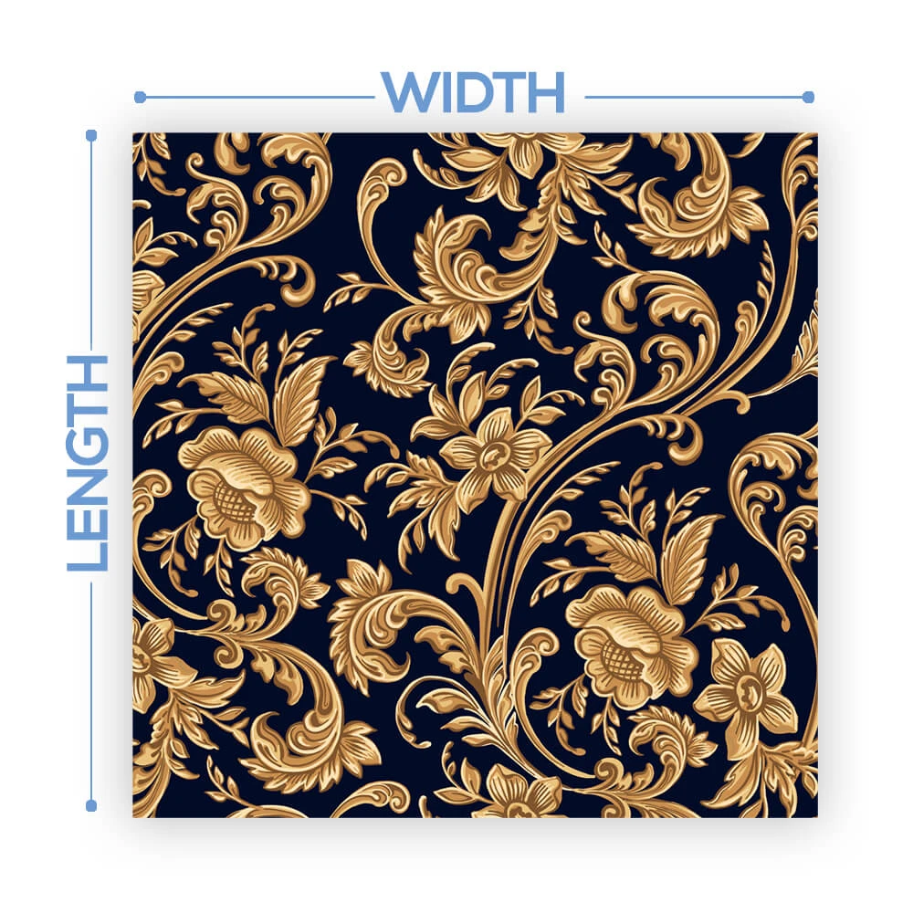 The width of the vinyl is 54″. We will cut the total length based on the size of your dance floor. Floors will come on a single roll requiring the installer to cut each row at design cutlines. These cut lines are printed on the design to make it easy!
