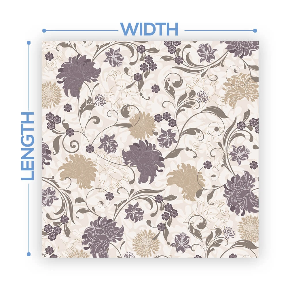 The width of the vinyl is 54″. We will cut the total length based on the size of your dance floor. Floors will come on a single roll requiring the installer to cut each row at design cutlines. These cut lines are printed on the design to make it easy!