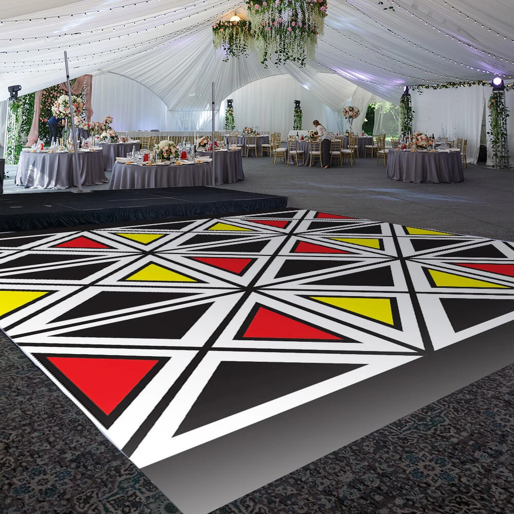This custom size dance floor wrap will transform your venue! Our Mondrian design belongs to our “Geometric” print designs for your most upscale events.Â