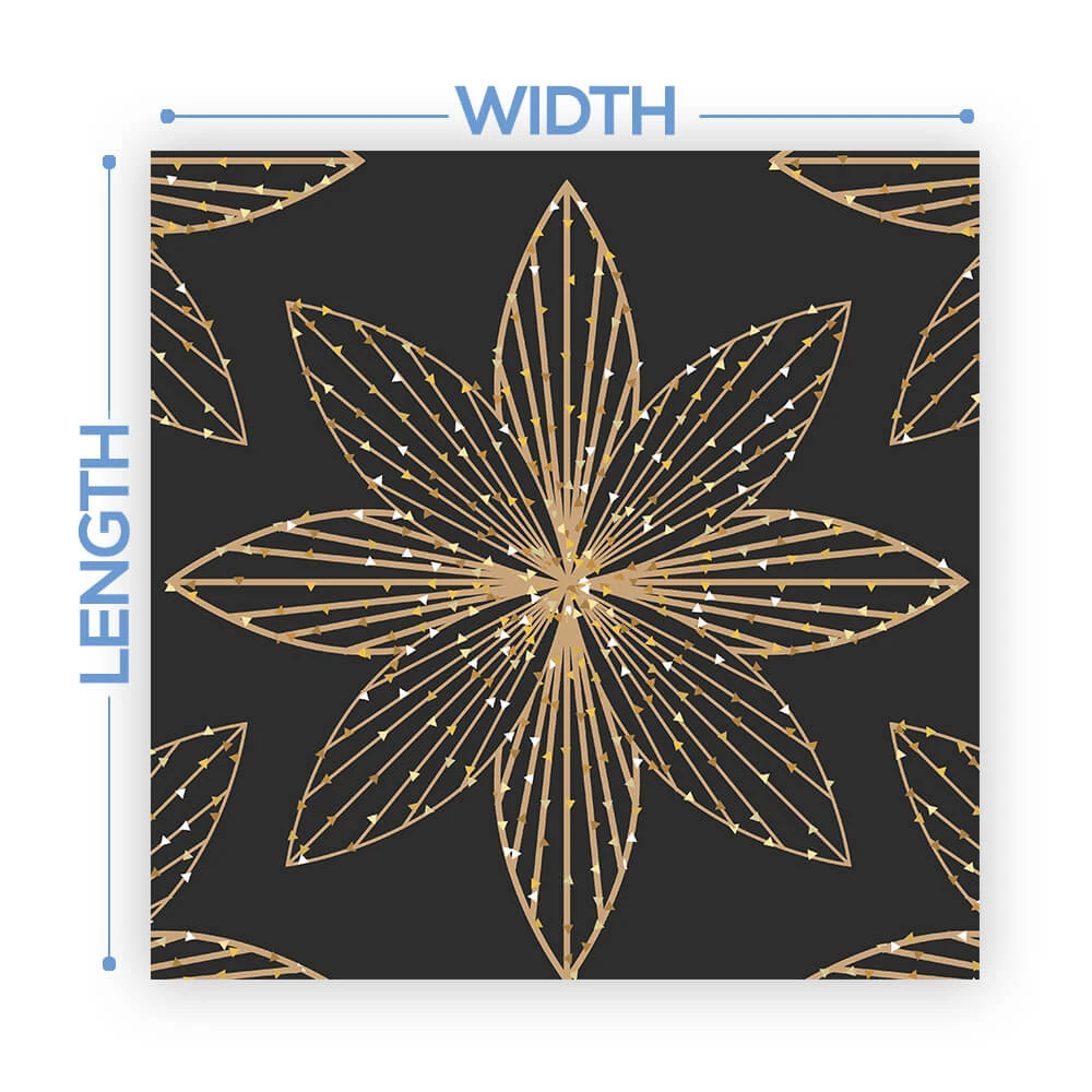 The width of the vinyl is 54″. We will cut the total length based on the size of your dance floor. Floors will come on a single roll requiring the installer to cut each row at design cutlines. These cut lines are printed on the design to make it easy!