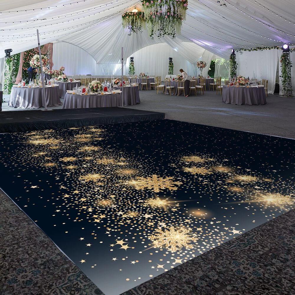 This custom size dance floor wrap will transform your venue! Our Star Struck design belongs to our “New Year’s Day” print designs for your most upscale events.Â