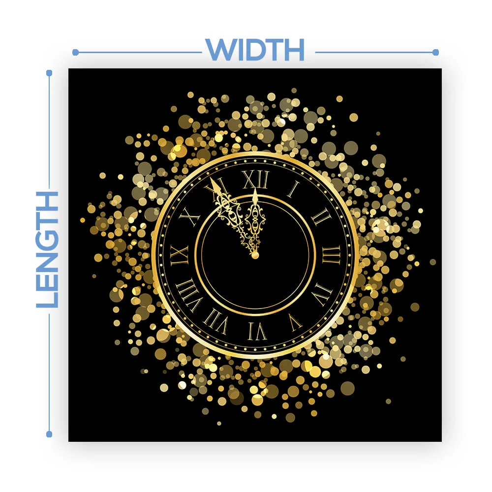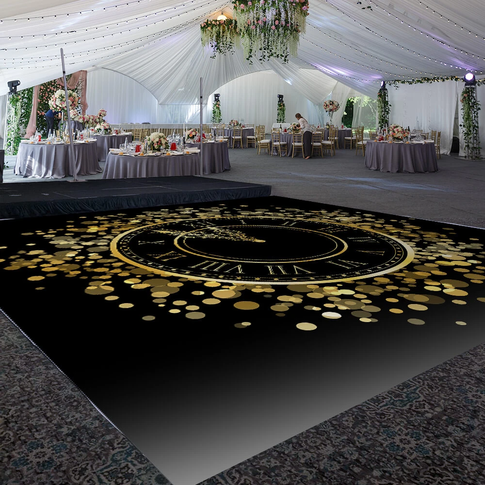 This custom size dance floor wrap will transform your venue! Our Strike Of The Clock design belongs to our “New Year’s Day” print designs for your most upscale events.Â
