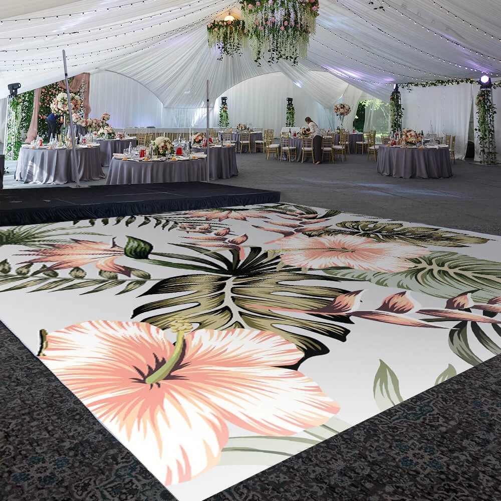 This custom size dance floor wrap will transform your venue! Our Blossom design belongs to our “Tropical” print designs for your most upscale events.Â